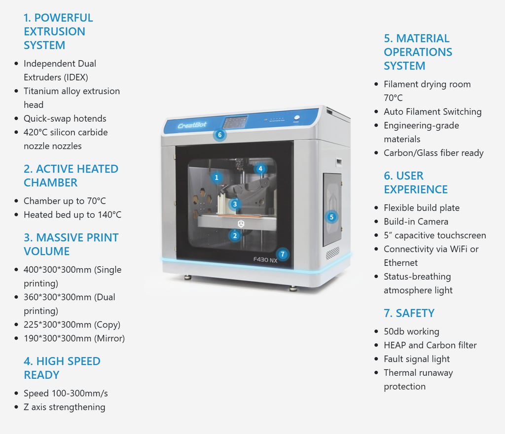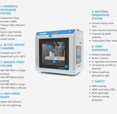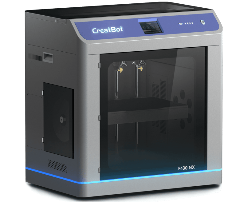 The CreatBot F430 NX is a high-performance industrial 3D printer designed for precision, durability, and versatility. It features an Independent Dual Extruder (IDEX) system, allowing users to print with multiple materials or colors simultaneously, also enabling copy and mirror modes for increased productivity.