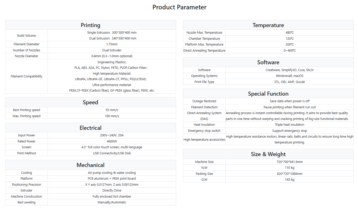 This is the best solution for printing engineering-grade materials with independent support materials, ensuring the best quality of engineering-grade material printing. It also supports copy, mirror, and backup mode printing.