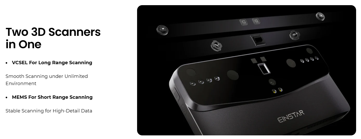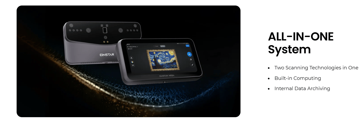The EINSTAR VEGA is a wireless, all-in-one handheld 3D scanner designed for versatility and ease of use in various environments. It integrates advanced scanning technologies and robust hardware to deliver high-quality 3D scanning solutions for both professionals and enthusiasts.