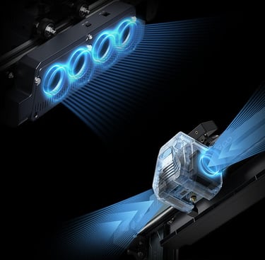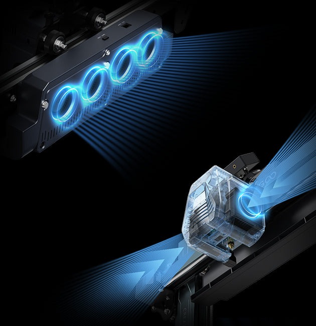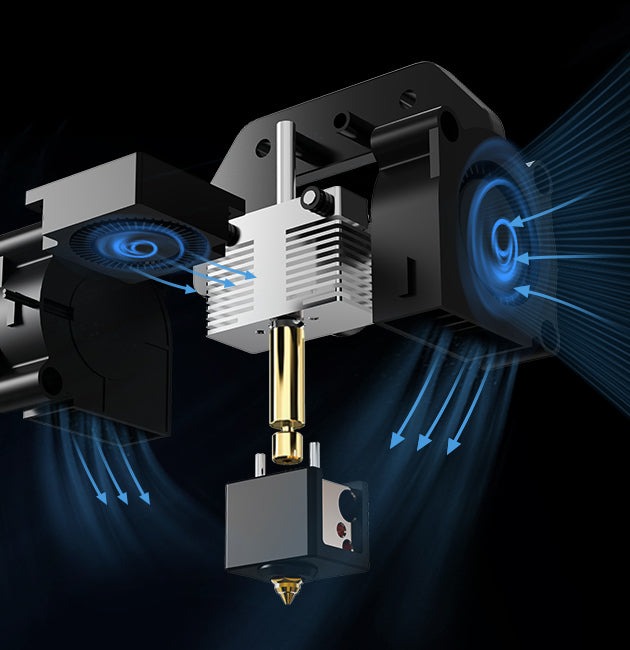 In addition to the two thickened 4015 ball bearing cooling fans on both sides of the print head, there are four 4020 ball bearing auxiliary fans behind the print head, which ensure omnidirectional rapid cooling of the newly printed layers even at a fast printing speed, and the deposited hot filament quickly bonds together for better overhang and bridge results.