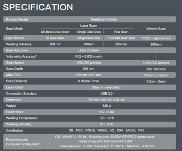 Experience the cutting-edge capabilities of the FreeScan Combo and Combo+, handheld 3D scanners that bring together the best of both worlds. These compact powerhouses combines dual light sources, including blue laser and infrared VCSEL, all packed into an ultra-compact all-metal shell.